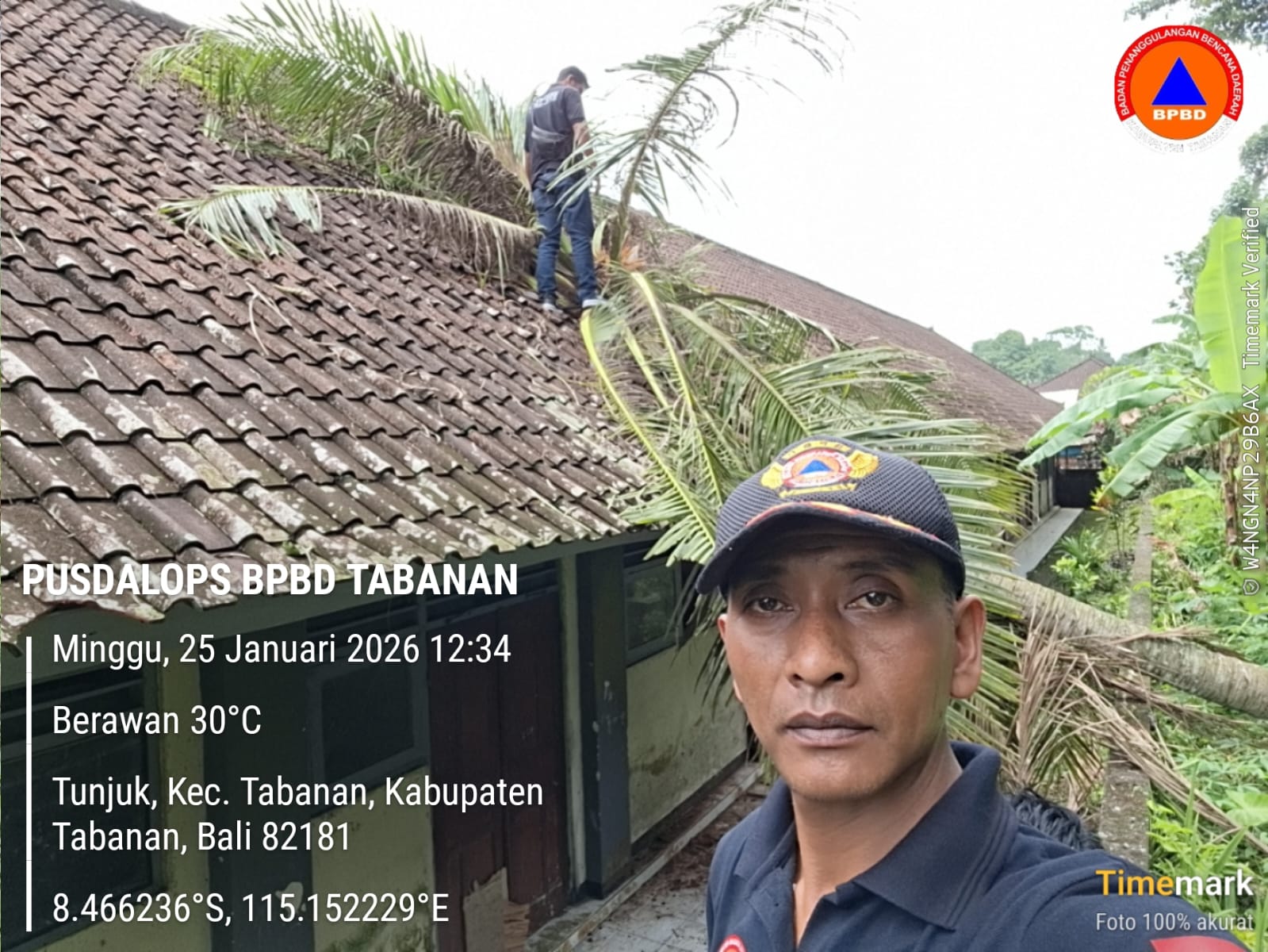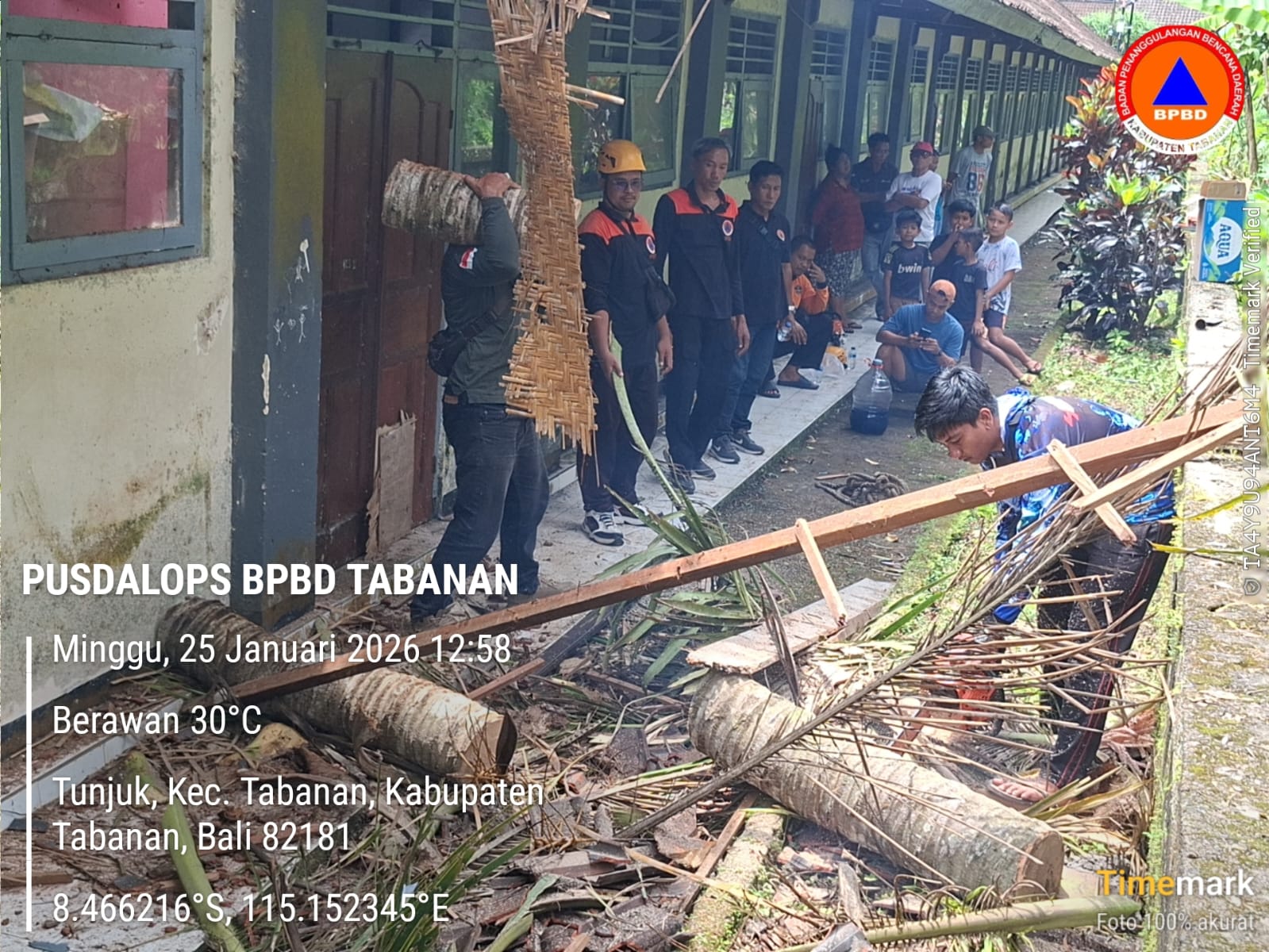 Penanganan Pohon Tumbang di SD NO 1 Tunjuk Tabanan , pohon jenis kelapa menimpa bangunan sekolah , akibat angin kencang yang terjadi pada pukul 23.00 wita kemarin malam dimana pohon sudah miring menyebabkan tumbangnya pohon tersebut. Penanganan dan pembersihan sudah dapat dilakukan oleh Tim Reaksi Cepat ( TRC) Regu 4 BPBD Tabanan. Kegiatan ini diatensi langsung oleh Bapak Wakil Bupati Tabanan, didampingi oleh Anggota DPRD Tabanan dan Bapak Kalaksa BPBD Tabanan. Tidak ada korban jiwa dalam peristiwa ini. Namun kerugian material bangunan yang tertimpa pohon di perkirakan kurang lebih RP 60 juta