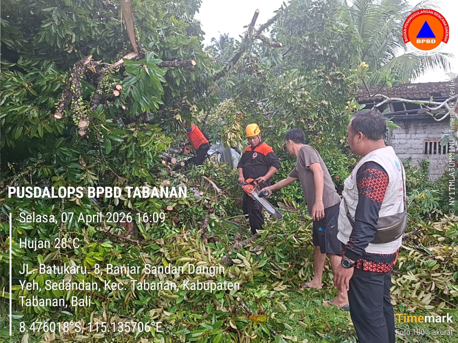 Peristiwa alam berupa angin puting beliung disertai hujan deras melanda wilayah Banjar Sandan Dangin Yeh, Desa Sesandan, Kecamatan Tabanan pada Selasa (7/4) sore sekitar pukul 16.00 WITA. Fenomena cuaca ekstrem ini menyebabkan sejumlah pohon tumbang dan kerusakan pada bangunan rumah milik warga setempat. Laporan kejadian tersebut segera diterima oleh Pusdalops BPBD Kabupaten Tabanan sesaat setelah kejadian melalui Kabid K&L BPBD Tabanan.