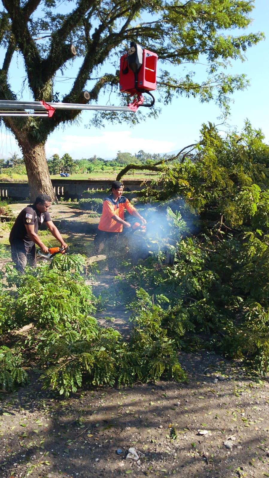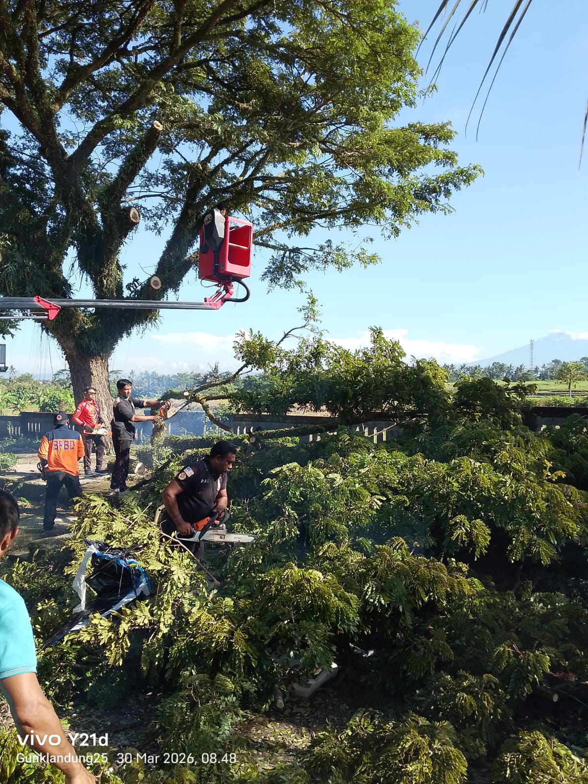 Perompesan dan Pembersihan pohon Mahoni pengerjaan dari pkl 07.50 s/d 12.30 Wita, Penanganan dan pembersihan dilakukan oleh personel PUSDALOPS dan TRC REGU 4 BPBD Tabanan bersama DLHK Tabanan. Kegiatan akan dilanjutkan besok pagi.