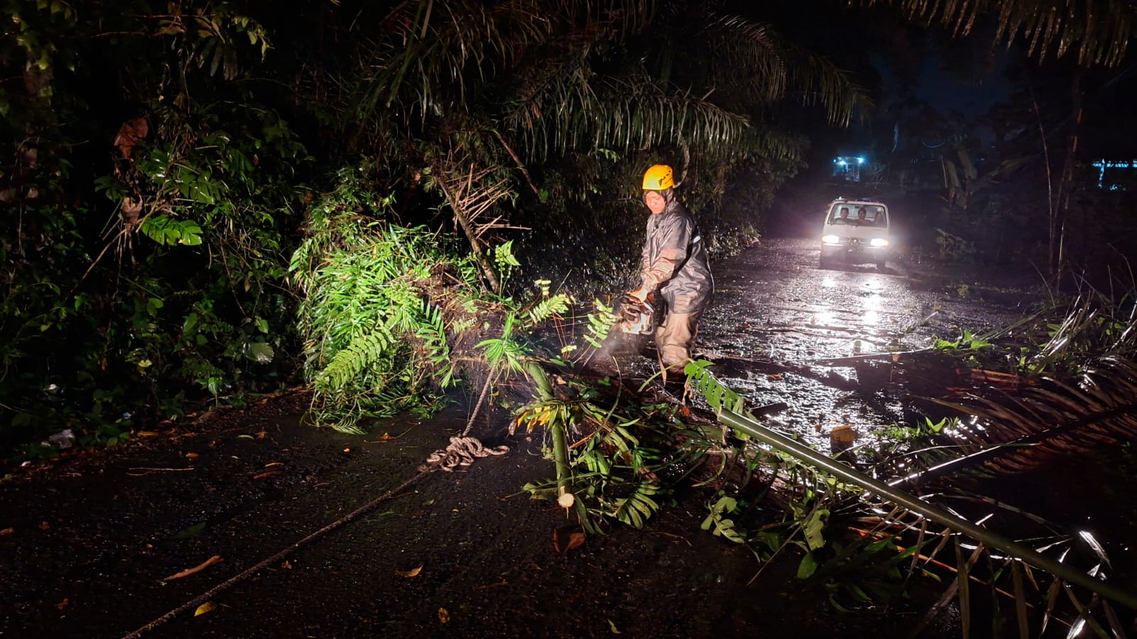 Penanganan pohon tumbang jenis pohon Aren, menutupi seluruh badan jalan, diameternya sekitar 90 cm, pohon tumbang yang disebabkan oleh hujan deras disertai angin kencang menyebabkan tumbangnya pohon tersebut.