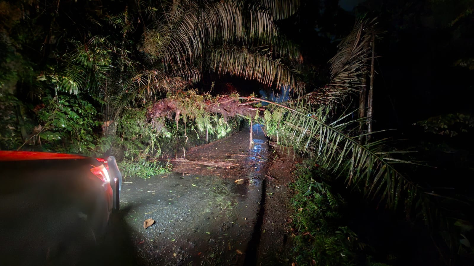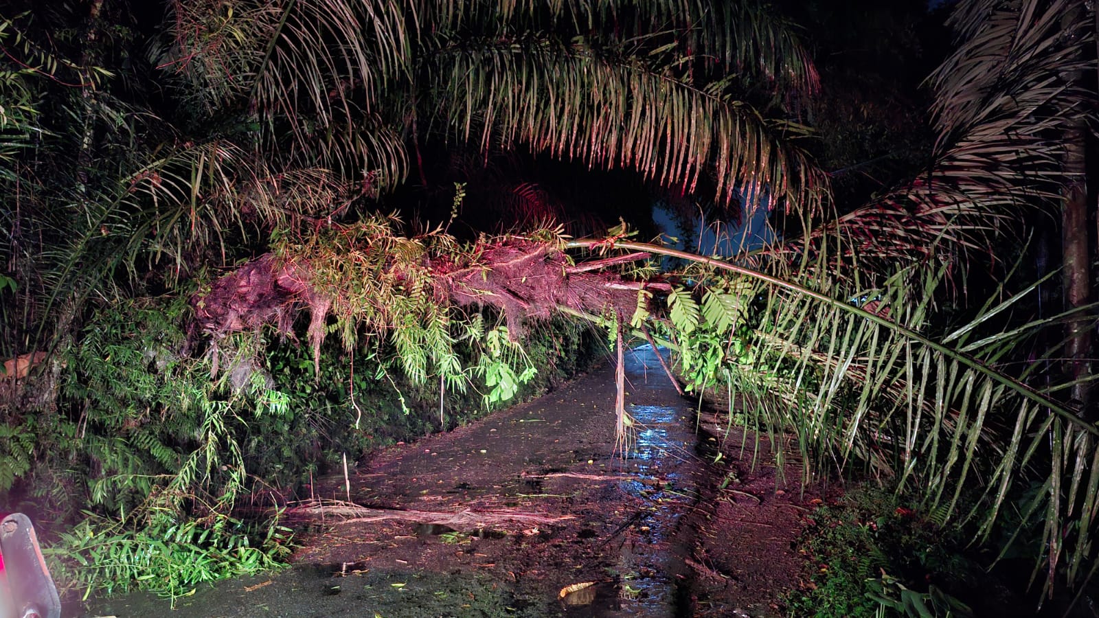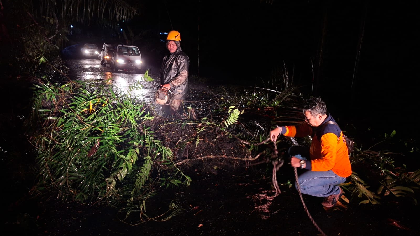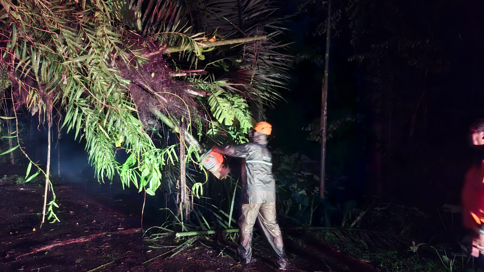 Penanganan pohon tumbang jenis pohon Aren, menutupi seluruh badan jalan, diameternya sekitar 90 cm, pohon tumbang yang disebabkan oleh hujan deras disertai angin kencang menyebabkan tumbangnya pohon tersebut.
